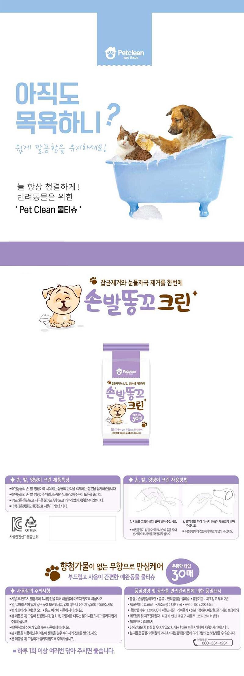 [강아지 고양이 물티슈] 펫크린 손발똥꼬 크린 물티슈 30매*56개입 (1박스)