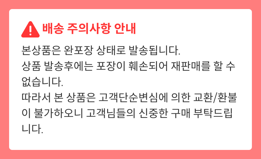 - 제품 특성상 단순 변심, 부주의에 의한 제품 손상 및 파손, 사용 및 개봉한 경우 교환/반품이 불가합니다.